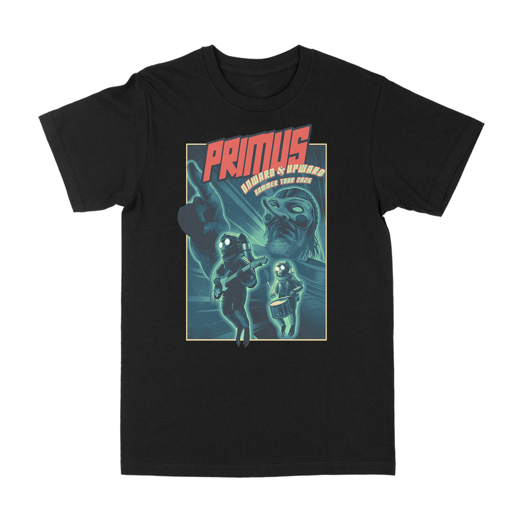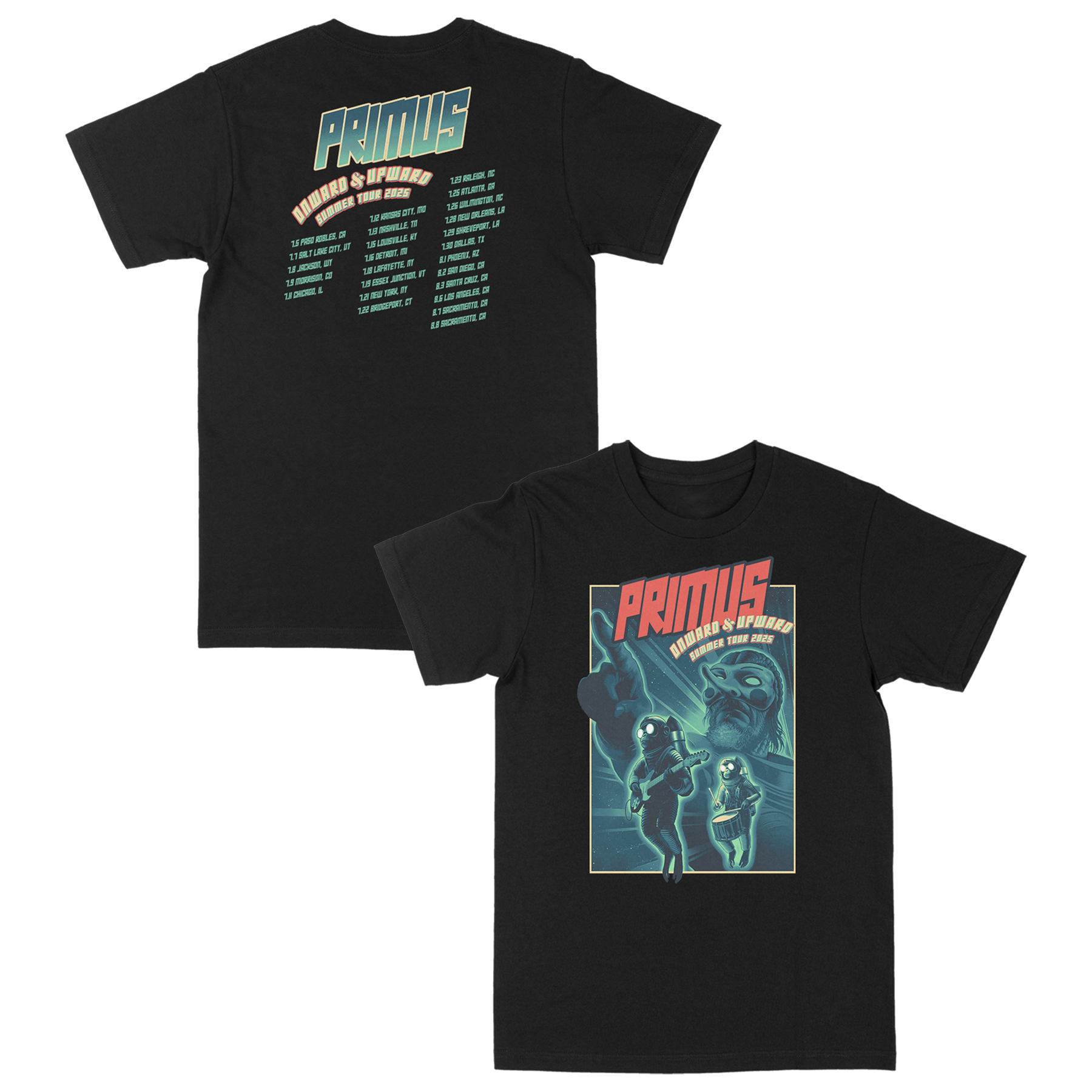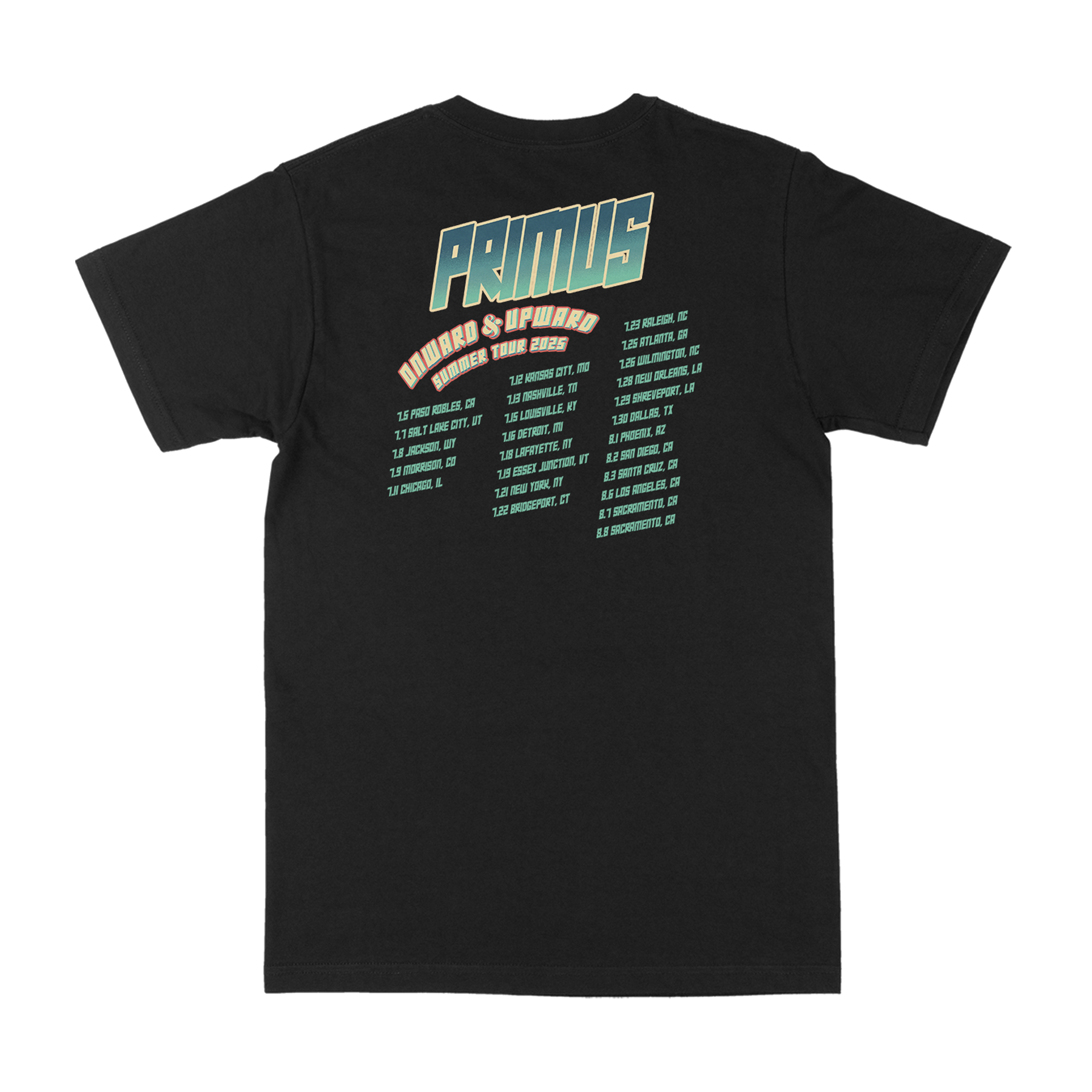 “Onward” design + Summer 2025 tour dates screenprinted on the front and back of a 100% cotton black t-shirt.
